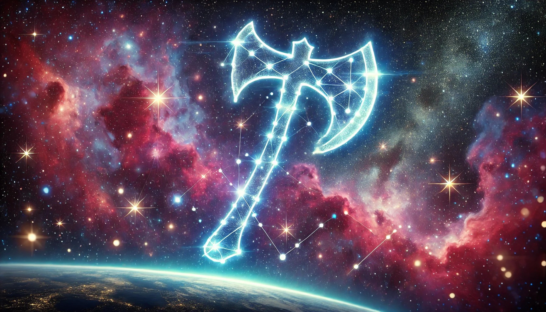 The image features a luminous constellation in the shape of an axe, glowing brightly against a vast, cosmic night sky. The axe’s handle and blade are clearly defined with bright stars connected by faint, glowing lines. The background is a mesmerizing expanse of space, filled with vibrant nebulae in shades of purple, pink, and blue, blending seamlessly into the dark void.