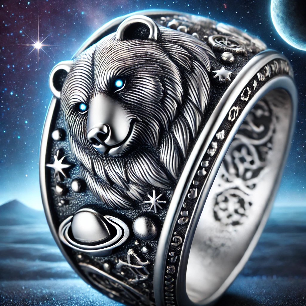 The “Space Bear Ring” is a captivating silver ring featuring a powerful bear with intricate cosmic patterns etched into its fur and paws. The bear’s eyes and body emit a soft, magical blue glow, symbolizing its strength and connection to the cosmos. The band is adorned with stars, planets, and galaxies, reinforcing the celestial theme.