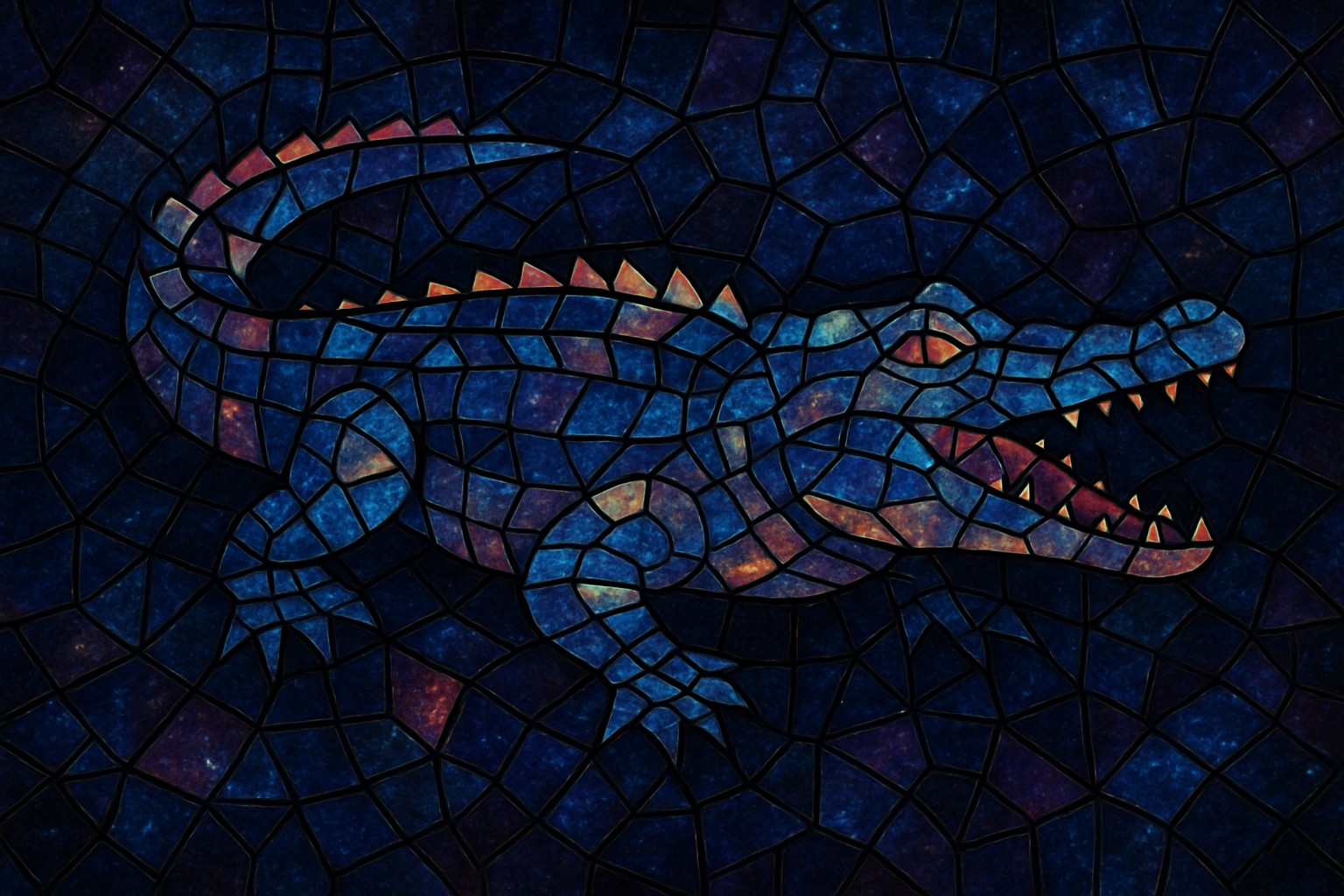 This image is a digital abstract mosaic in the shape of a crocodile, set against a cosmic space-themed background. The crocodile is formed from vibrant, irregularly shaped tiles that resemble stained glass or ceramic shards. The tiles within its body transition in color from deep purples and blues to fiery reds and oranges, creating a dynamic, galaxy-like effect.