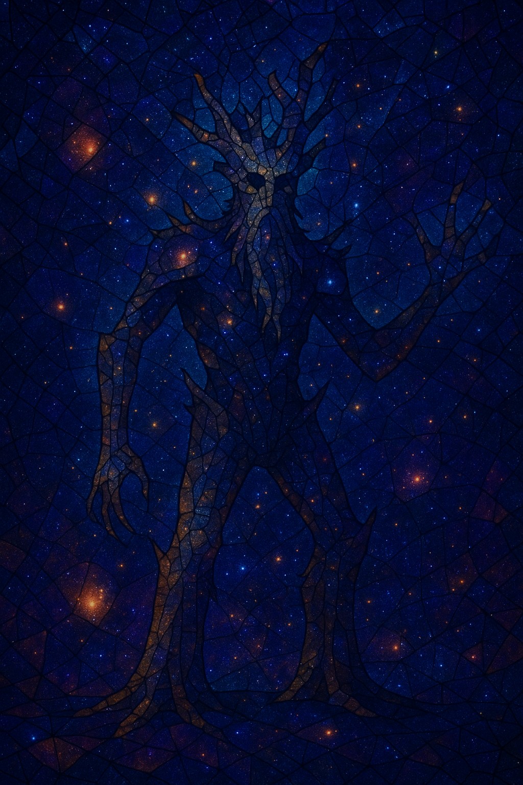 This digital artwork presents an awe-inspiring mosaic depiction of an Ent, a mythical tree-like guardian, rendered in an abstract style that integrates the vastness of space. The figure is composed of interlocking, unevenly shaped tiles that shimmer with cosmic energy—deep blues, glowing purples, and radiant bursts of orange and gold emulate galaxies and nebulae within each segment.