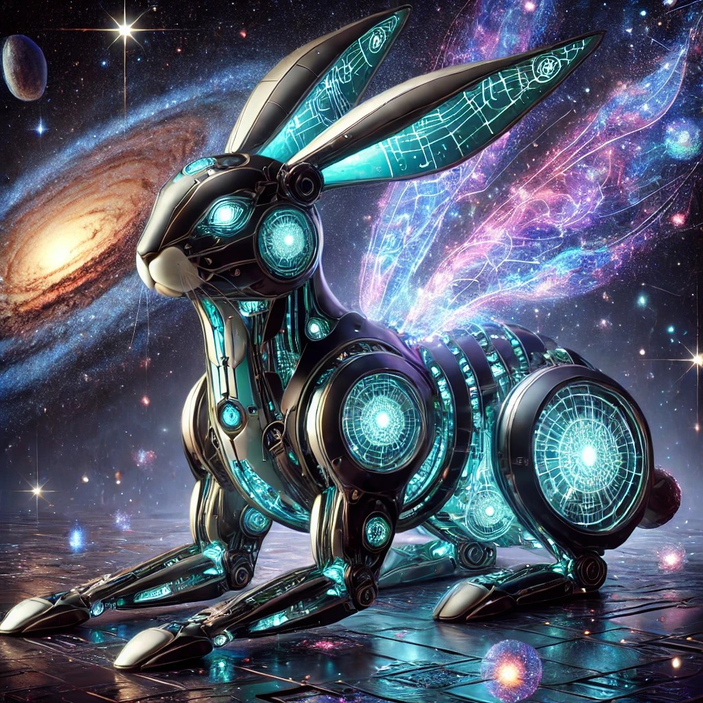 The scene features a stunning space-themed rabbit automaton, a harmonious fusion of celestial elegance and advanced robotics. Its sleek black and silver armor shimmers under a cosmic glow, adorned with intricate neon blue and purple patterns that resemble star maps etched across its surface. These patterns pulse softly, evoking the infinite mysteries of the universe.