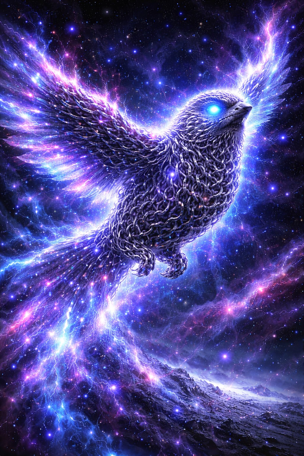 The image showcases a magnificent sparrow crafted from shimmering silver chains, soaring through the vastness of space. Its body is intricately woven with glowing chains, radiating a cosmic energy that illuminates the surrounding void. The bird’s radiant wings trail vibrant stardust in shades of blue, purple, and pink, leaving a mesmerizing trail as it glides through the stars.