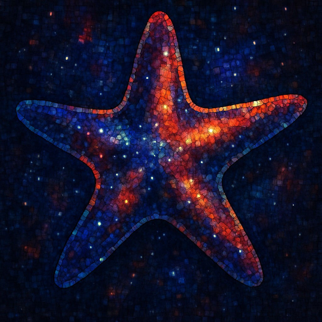 This image depicts a digital abstract mosaic in the shape of a starfish, intricately composed of small, colorful tiles that form a vivid, cosmic design. The starfish is centered and features radiant hues of deep blues, fiery reds, oranges, and subtle yellows, giving the impression of nebulae and stardust within its form. The background resembles outer space, filled with faint stars and distant galaxies in soft whites, purples, and blues.
