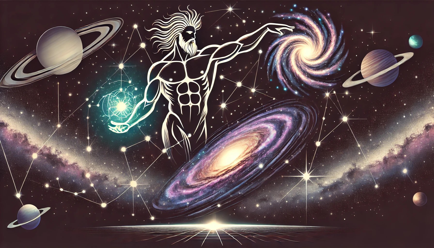 The image depicts a stunning night sky featuring a constellation shaped like a titan embodying the element of space. The titan is a colossal figure outlined by radiant stars, with muscular arms and a majestic celestial cape that resembles a flowing galaxy. One hand holds a swirling vortex of stars and galaxies, glowing intensely with cosmic energy, while the other cradles an orb resembling a luminous nebula.