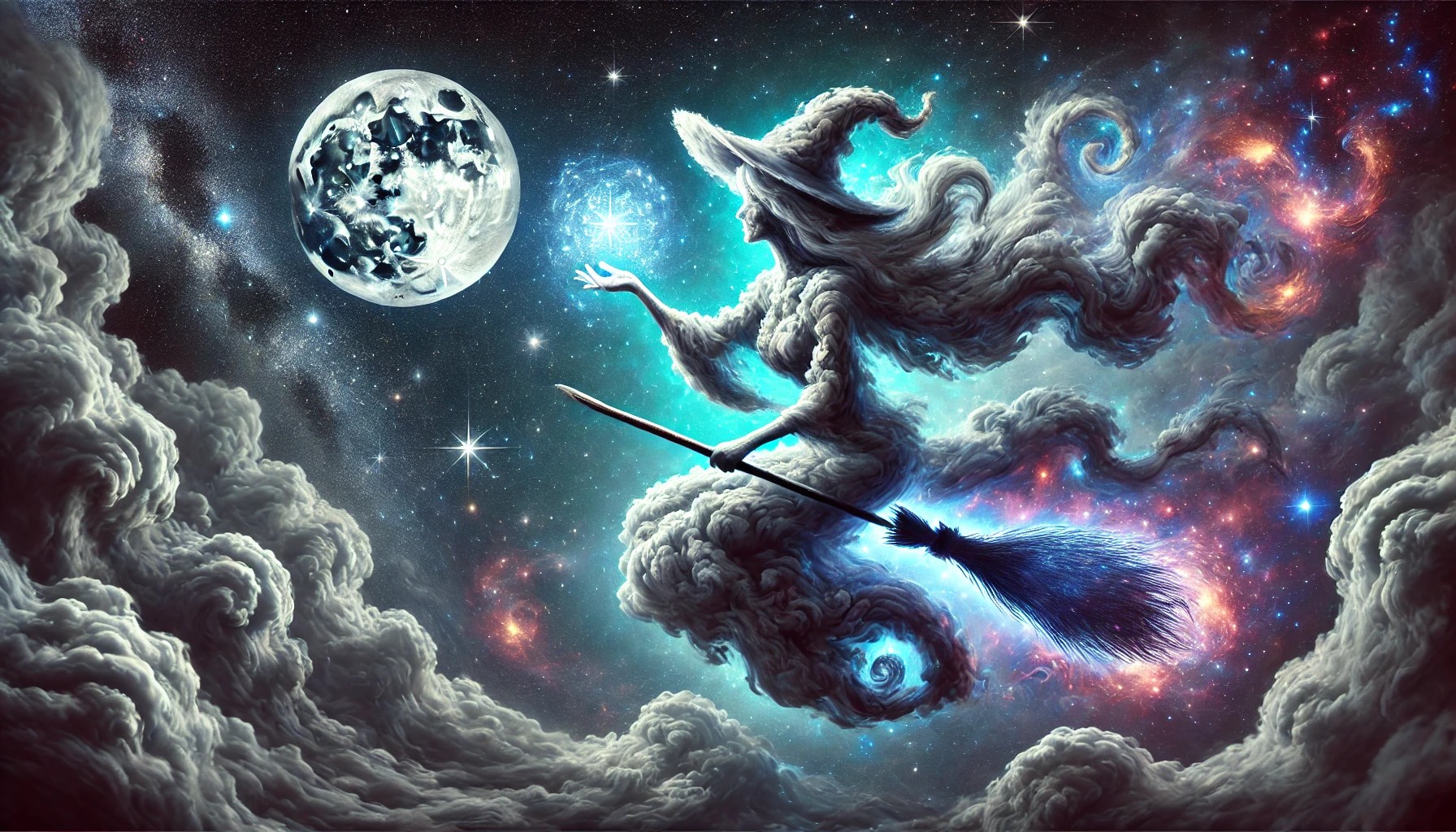 The image showcases a surreal, magical night sky where a cloud formation resembles a mystical witch soaring across the stars. The witch’s body is formed from soft, swirling clouds, with a pointed hat and a flowing cloak trailing behind her like cosmic smoke. One hand reaches forward, casting a glowing spell that radiates with shimmering blue and purple energy, reminiscent of the Milky Way.