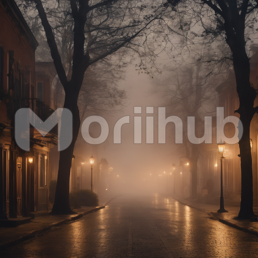 As twilight casts its hazy spell, a misty town emerges from the shadows along a deserted road. Withered trees, silhouetted on both sides, stand as spectral sentinels. Soft, road-side lamps flicker, casting an ethereal glow on the path ahead. The mist imparts an otherworldly ambiance, creating a hauntingly beautiful scene. The quiet road beckons, weaving through the mysterious mist and whispering tales of forgotten streets in this atmospheric town lost in the embrace of evening fog.