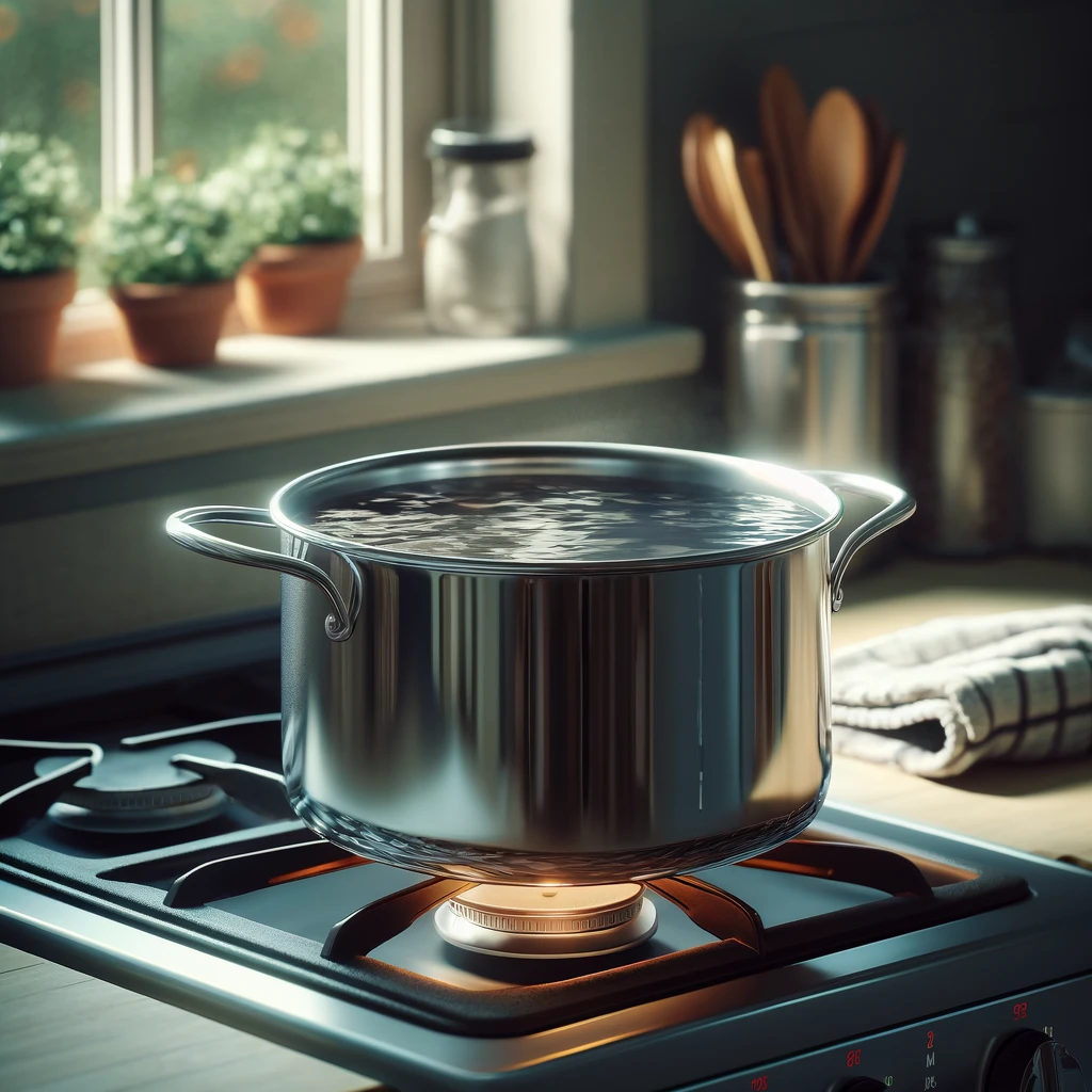 In this tranquil kitchen scene, a stainless steel pot sits atop a silent stove, its contents a clear pool of still water. The stove, dormant for now, awaits the call to action. The scene is one of quiet anticipation, where culinary magic is poised to unfold at the flick of a switch.
