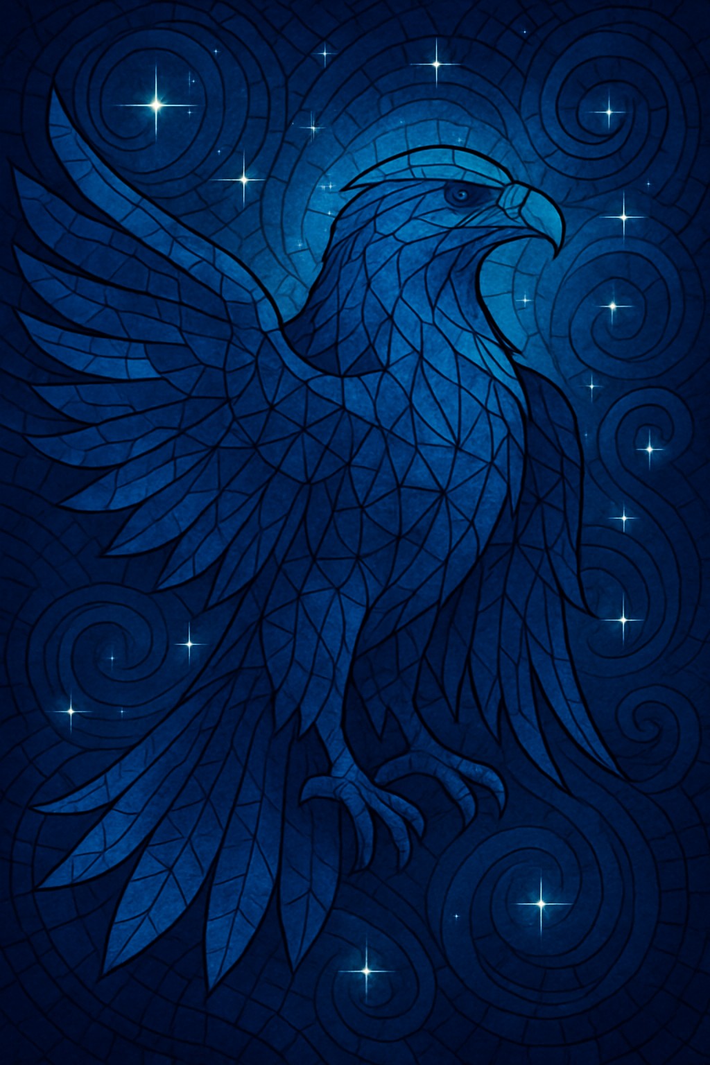 This digital mosaic artwork features a majestic eagle rendered in radiant shades of midnight blue and indigo, evoking a celestial presence. The eagle’s form is composed of intricate, angular glass-like segments, resembling stained glass. Its powerful wings stretch outward as if in mid-flight or about to soar, while its keen eye gazes forward with purpose.