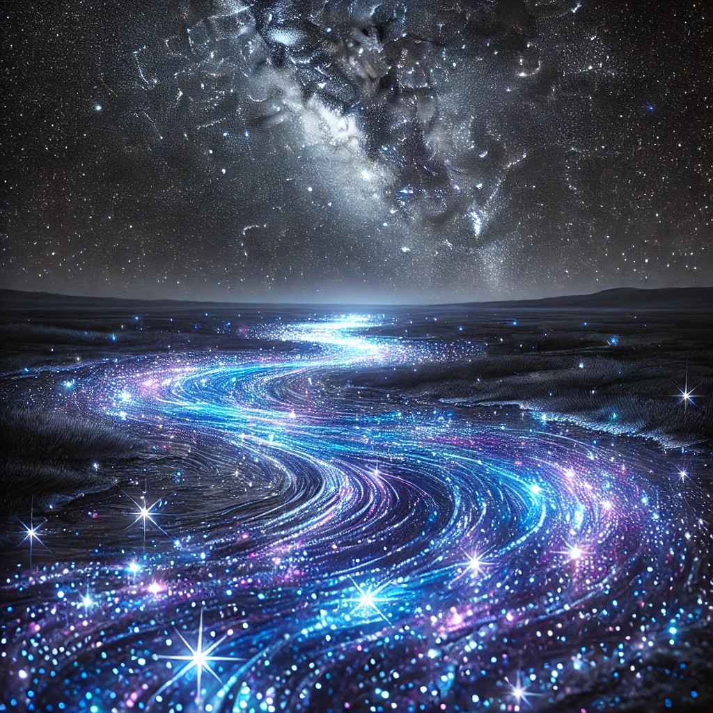 River flows with glowing starlight instead of water. The river sparkles with tiny stars, nebulae, and cosmic dust, creating a magical, celestial appearance. The colors are rich, with deep blues, purples, and silvery light reflecting off the surface. The surrounding landscape features a calm, night-time setting with a clear sky full of stars, enhancing the sense of cosmic wonder as the river flows gently, illuminating everything around it.