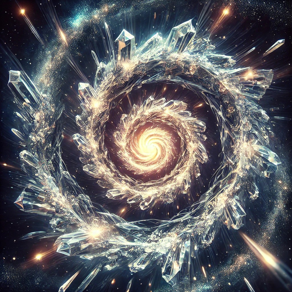 The image showcases a swirling crystal vortex, composed of clear, shimmering crystals that spiral inward. As the vortex twists, it is filled with streaks of starlight, representing distant stars and galaxies intertwined within the vortex’s form. The core of the vortex glows softly, emitting a celestial light reminiscent of a distant star, while smaller bursts of starlight flicker and pulse around it. The entire scene exudes a sense of cosmic energy and the vast, mystical power of the universe, all set against a dark, celestial background filled with the endless depths of space.
