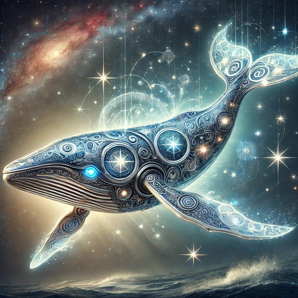 The artwork presents a mesmerizing starlight whale automaton, a mechanical marvel that captures the elegance and mystery of the cosmos. Its sleek metallic body is intricately adorned with glowing star patterns, shimmering constellations, and designs that mimic the brilliance of a starry night sky. The surface gleams with celestial energy, as if it holds the light of countless galaxies within its frame.
