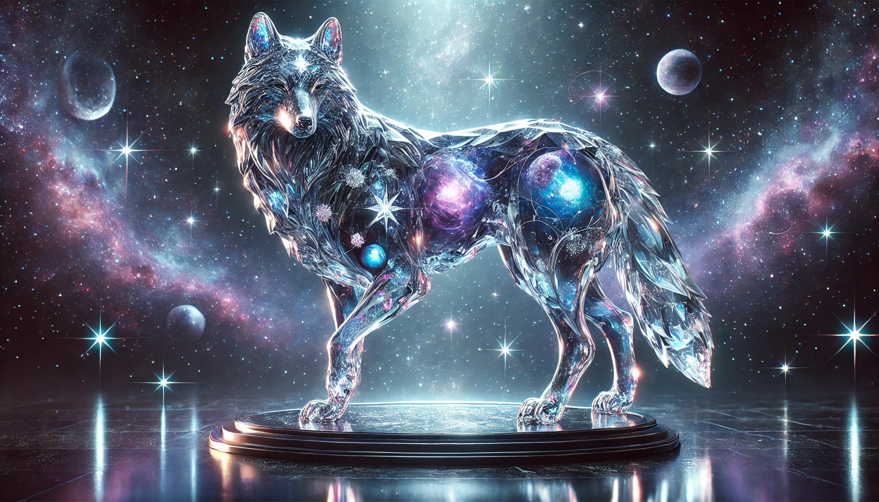 The image showcases a breathtaking crystalline wolf infused with the essence of starlight, standing majestically on a reflective celestial platform. Its body is crafted from translucent, shimmering crystal, radiating deep blues, purples, and silvers that mirror the beauty of the night sky. Swirling within its form are glowing constellations and nebula-like patterns, giving it a cosmic and ethereal presence.