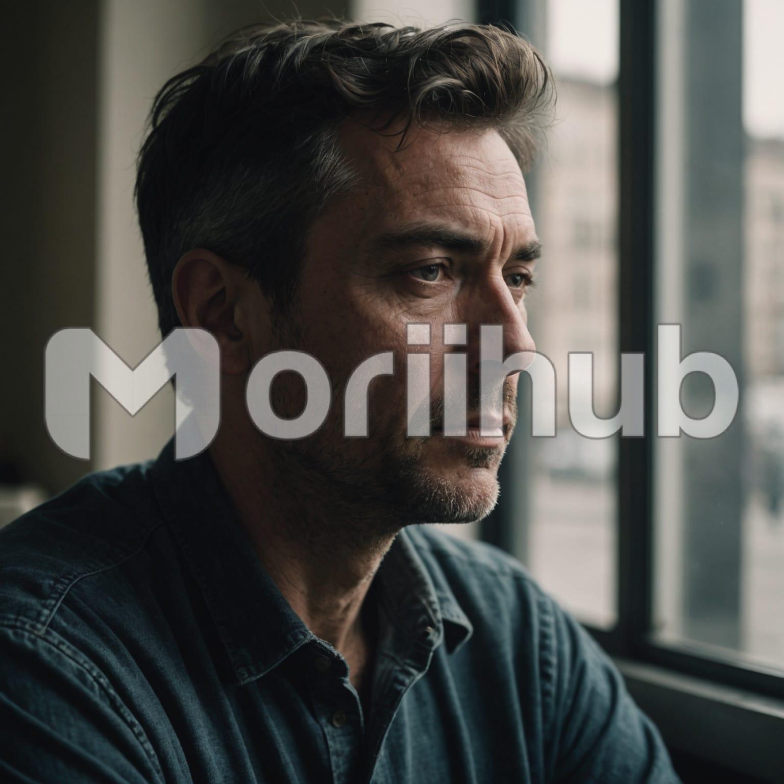 A man sits quietly, lost in thought, his gaze fixed on the window before him. The room around him is hushed, the window offering a view that seems to capture his attention. Outside, the world moves in muted tones, perhaps echoing the stillness within. His expression, a mix of introspection and quiet resolve, suggests a moment of deep reflection. In this tranquil scene, the window becomes a portal to his thoughts, capturing a solitary figure immersed in inner contemplation.