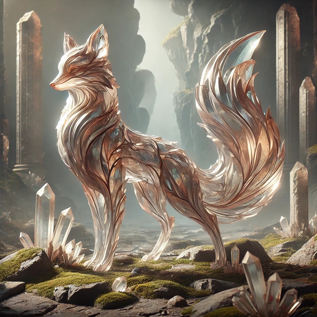The image features a mesmerizing crystal fox infused with the stone element, standing gracefully in a mystical, rocky landscape. The fox’s body is sculpted from translucent crystal, blending earthy tones with stone-like textures that create a harmonious mix of crystal clarity and rugged rock. Its eyes emit a soft, mysterious glow, enhancing its mystical aura. The fox’s fur resembles crystalline shards interwoven with smooth stone, while its tail is composed of layered crystal that mimics natural rock strata, symbolizing geological strength and stability.