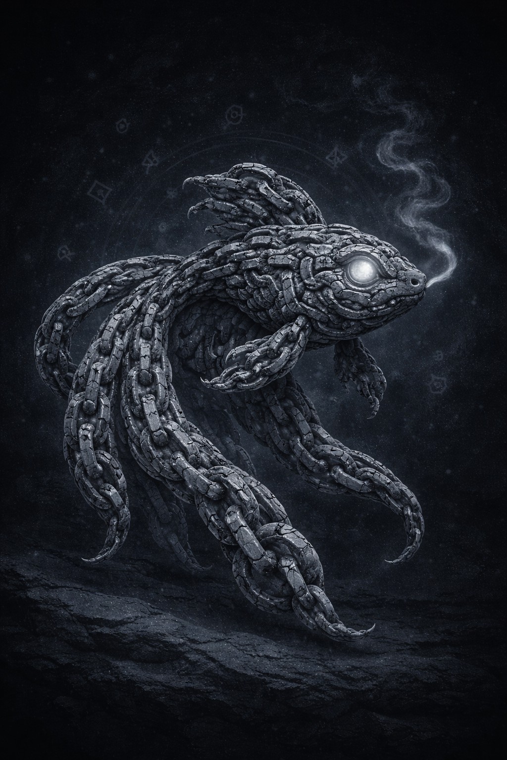 The stone goldfish is a mesmerizing creature formed from interwoven stone links. Its body, crafted from weathered and etched chains, flows elegantly through a dark, mystical backdrop. The fish’s glowing eyes emit an ethereal light, while a misty wisp of smoke escapes from its mouth, adding to its otherworldly presence.