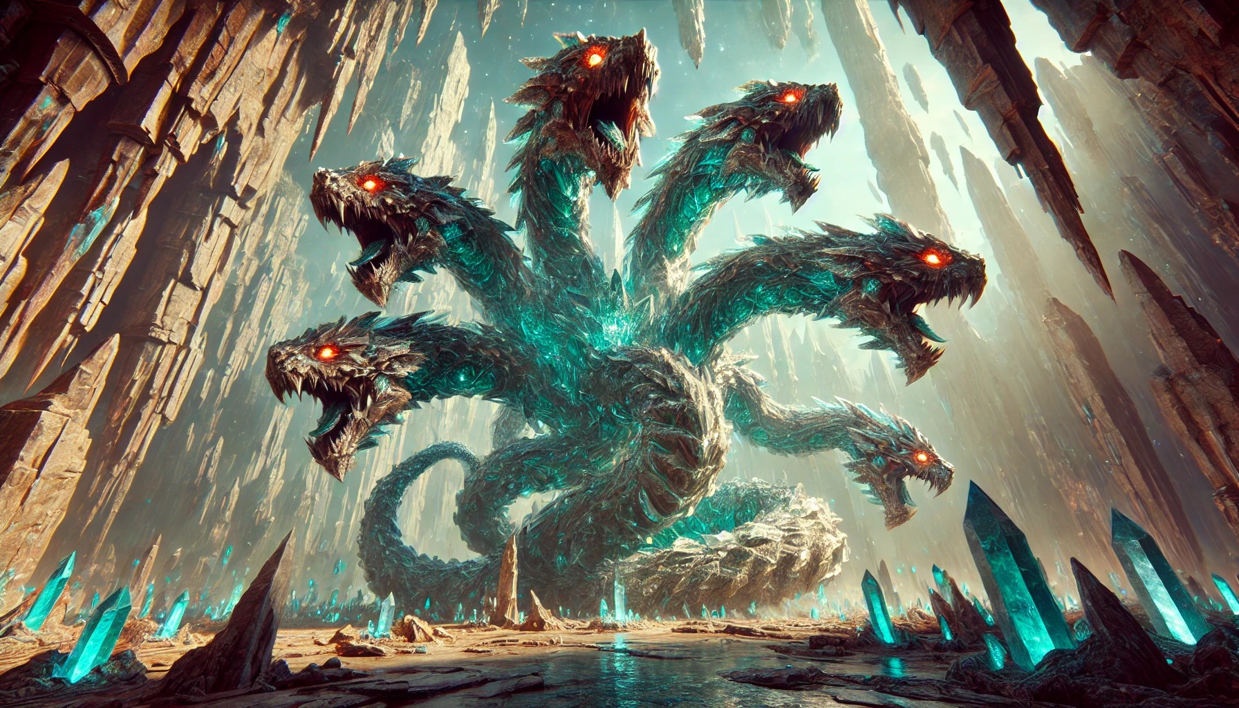 This colossal multi-headed beast stands amidst an ancient, mystical canyon, its serpentine heads made of jagged, translucent crystal rock, each glowing with an inner earthen energy.
