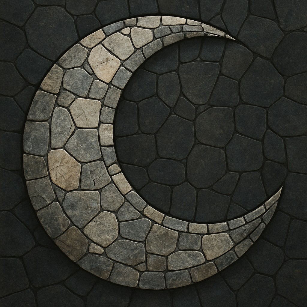 This image is a digital abstract mosaic crafted in the shape of a crescent moon. The mosaic is composed of irregular stone tiles in earthy tones such as gray, beige, and brown, each piece contributing to a textured, organic appearance. The stones are arranged precisely to form the curvature of the moon, set against a darker, almost black stone background made of larger, uneven tiles.