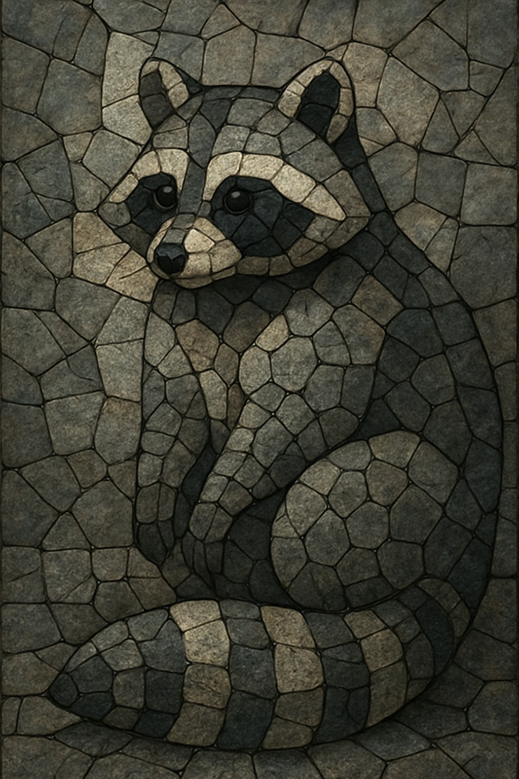 This image is a digital abstract mosaic artwork depicting a raccoon. The raccoon is formed entirely from irregular, stone-like tiles in earthy tones of gray, brown, and black. Each tile varies in shape and texture, creating a cracked, natural stone effect. The raccoon is shown in profile with its signature mask-like facial markings, dark eyes, and ringed tail clearly defined by contrasting tile colors.