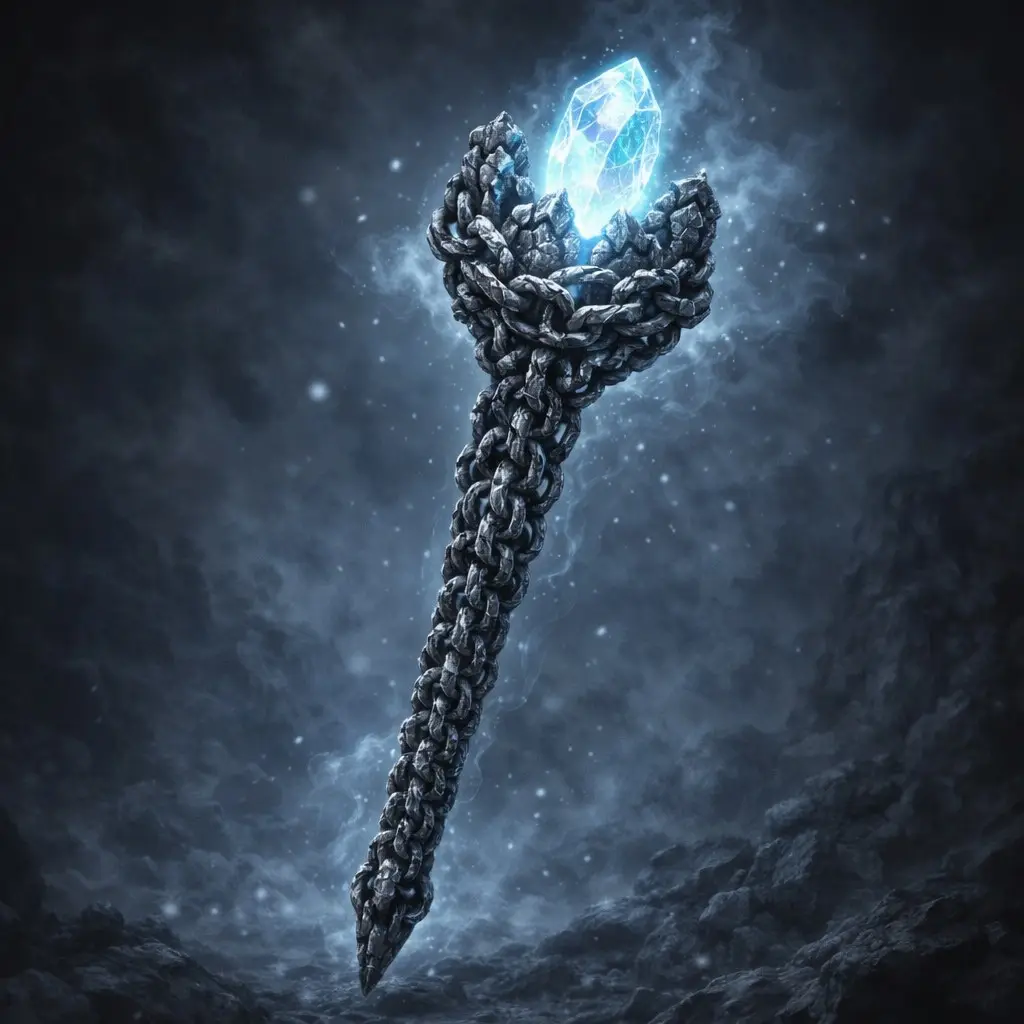 The image showcases a scepter made of interwoven chains resembling rough stone. At the top of the scepter, a large, multifaceted crystal glows with a brilliant blue-white light, casting an ethereal glow. The chains, rugged and jagged, give the scepter an ancient, elemental feel, as if crafted from the heart of the earth itself.