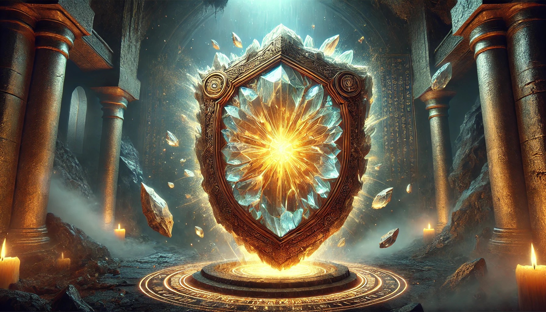 The Crystal Shield of Earth’s Might is a colossal, indestructible barrier, forged from pure, translucent crystal fused with the raw essence of stone. Its rugged, jagged surface resembles an ancient rock formation, yet it glows with a mystical golden energy that pulses through deep veins within the crystalline structure. Despite its rough, unyielding form, the shield reflects light in an almost ethereal way, enhancing its divine presence.