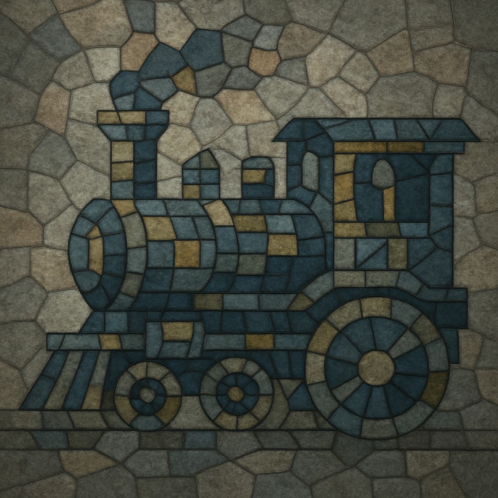 This image depicts a digital abstract mosaic artwork in the shape of a steam locomotive. The train is constructed from irregular, stone-like tiles in muted earthy tones—shades of gray, brown, and golden beige, contrasted with deep blue. Each part of the train, including the smokestack, cabin, and large circular wheels, is carefully outlined in mosaic form, giving it both a geometric and textured appearance.