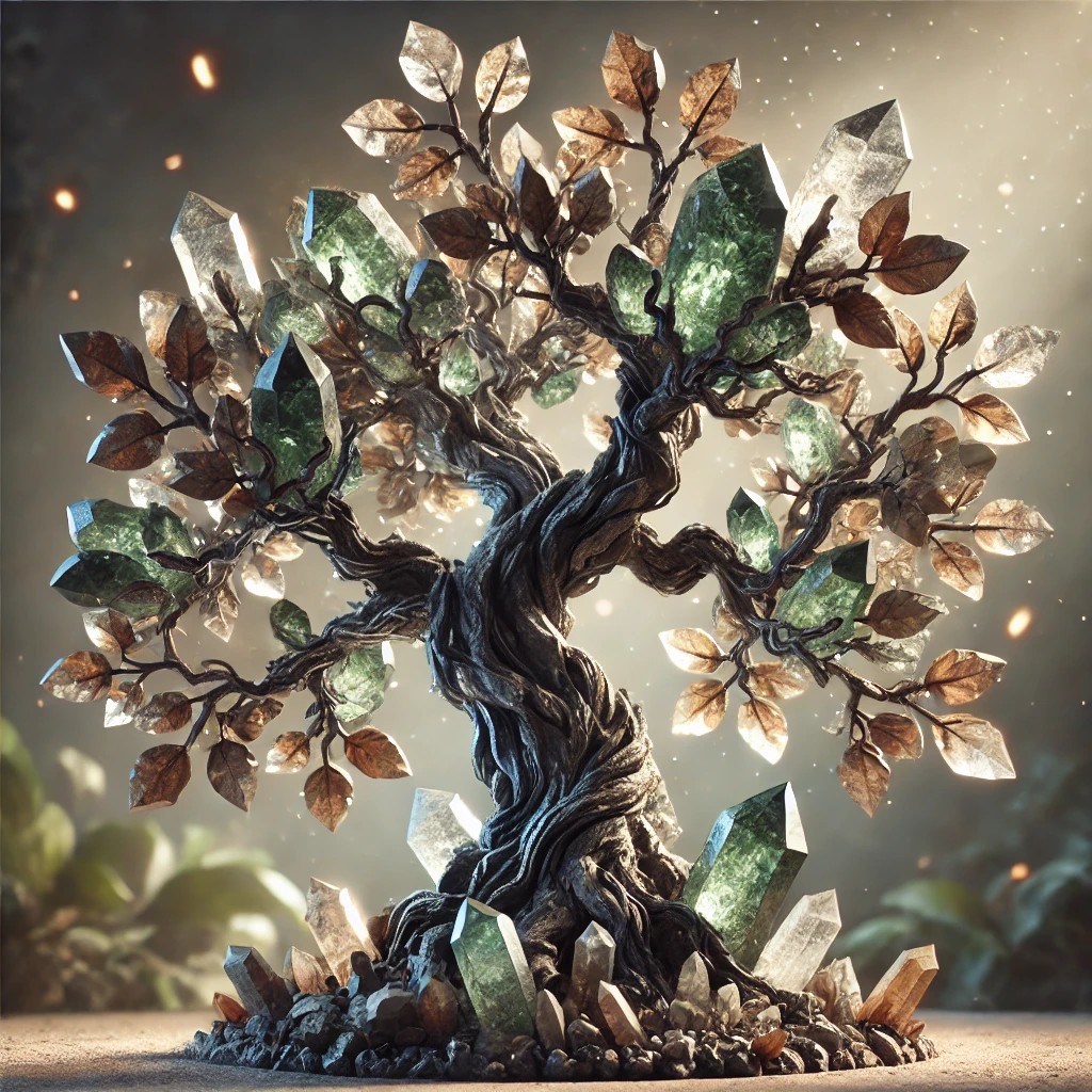 The image features a majestic crystal tree made entirely from stone elements. The trunk of the tree is composed of dark, jagged stone, with smaller crystals protruding from its surface. The branches stretch outward, made from rough, polished stones that give the tree an ancient and durable look. The leaves are smooth, translucent stone fragments in earthy shades of brown, gray, and deep green, symbolizing the stone element.
