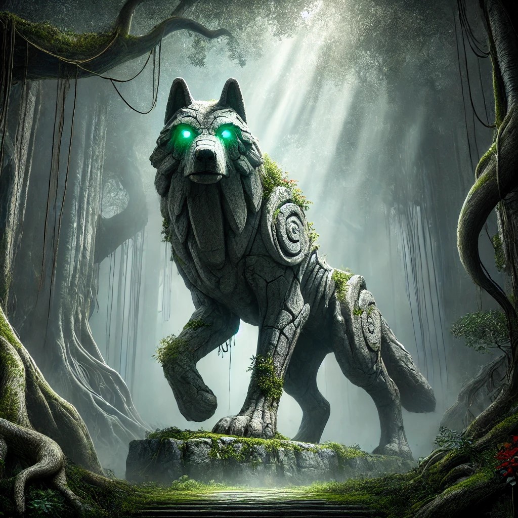 “A formidable stone wolf standing guard in an ancient, mystical forest. The wolf’s body is composed of rough, gray stone with cracks and moss covering its surface. Its eyes are glowing emeralds, radiating a soft green light. Vines and small plants grow along its back and limbs, blending it seamlessly with the forest environment.