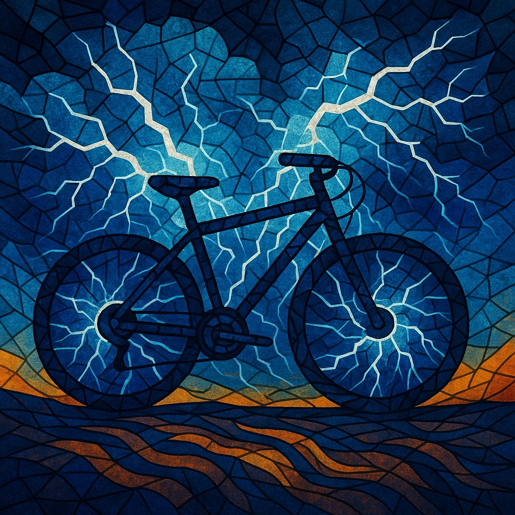 The image features a digital abstract mosaic depicting a bicycle as the central figure. The entire artwork is composed of geometric, polygonal shards, giving it a stained-glass-like texture. The bicycle frame is formed using dark blues and blacks, outlined in thick black lines, emphasizing its silhouette. The background swirls with storm elements—a dramatic sky of deep blues, purples, and teals, fractured by vivid white and light blue lightning bolts that add motion and tension.