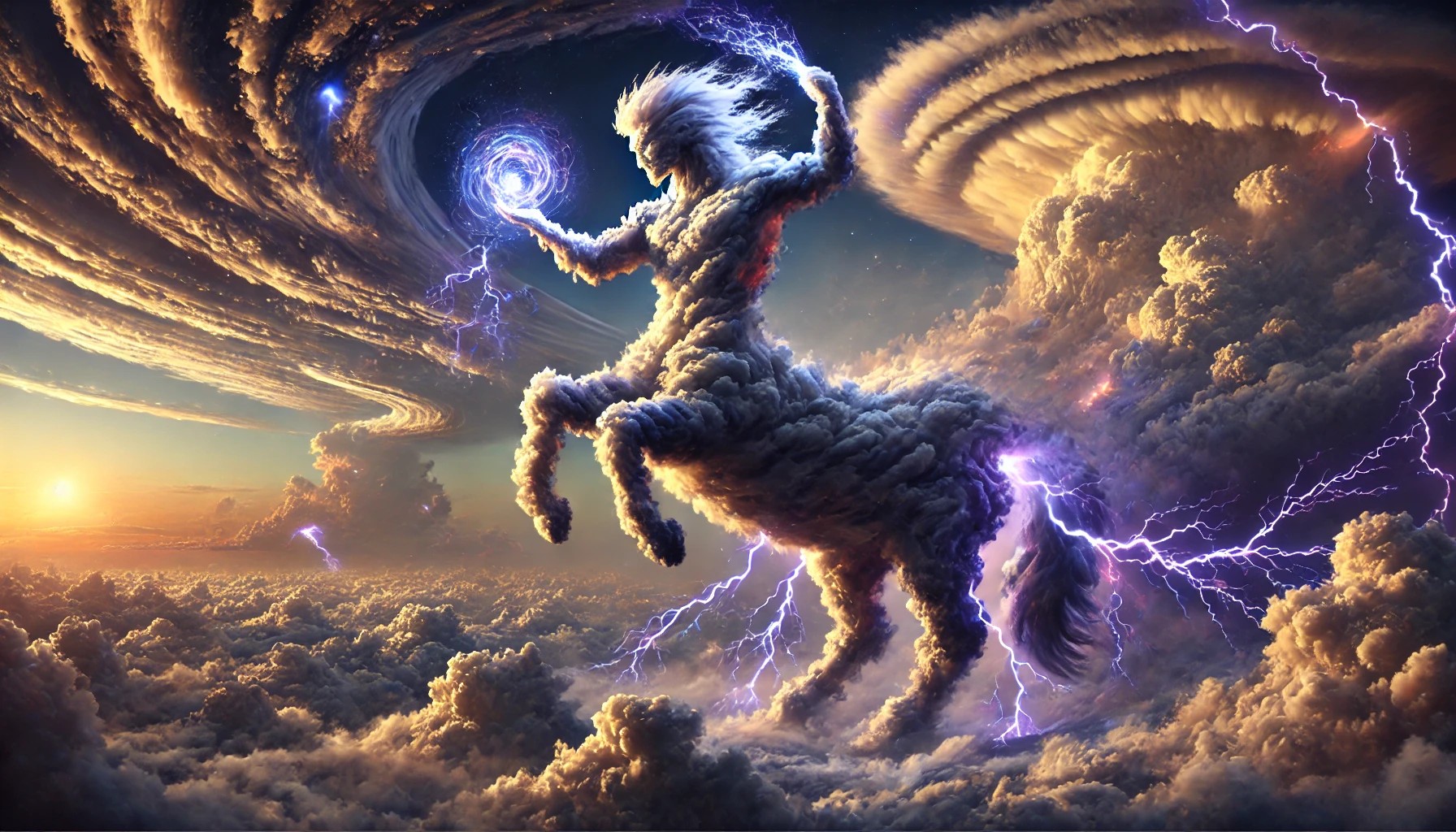 The image portrays a majestic, stormy sky where a massive cloud has taken the shape of a centaur. Its muscular upper body rises powerfully from the swirling clouds, while its lower half seamlessly forms into a horse-like shape. The centaur’s arms are raised, summoning arcs of crackling lightning in vibrant electric blue and violet, which streak across the sky and illuminate its misty form.