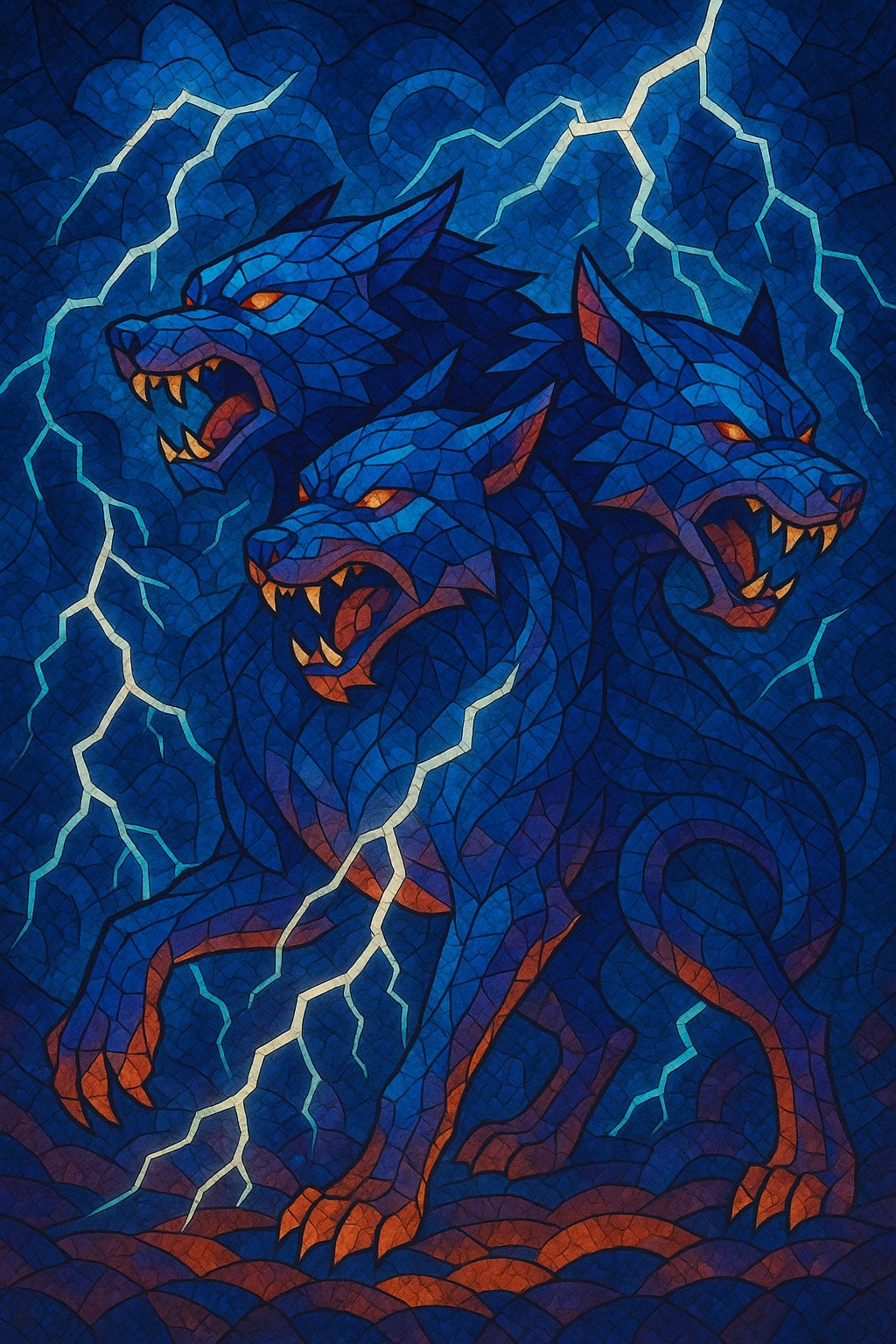 This digital artwork features a mosaic-style depiction of Cerberus, the legendary three-headed hound of Greek mythology. Each head snarls ferociously with glowing orange eyes and exposed fangs, exuding menace and raw power. The piece uses abstract, stained-glass-like fragments in deep blues and purples, accented with fiery oranges and reds to define the creature’s muscular form and stormy presence.