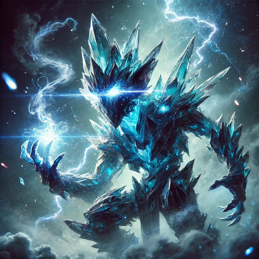 In a dark, stormy setting, a crystal goblin stands tall, its jagged body composed of translucent blue and purple crystals that shimmer with an ethereal glow. Lightning arcs across its form, crackling with raw storm energy. The goblin’s glowing white eyes pierce through the shadows, exuding a powerful, mystical presence.