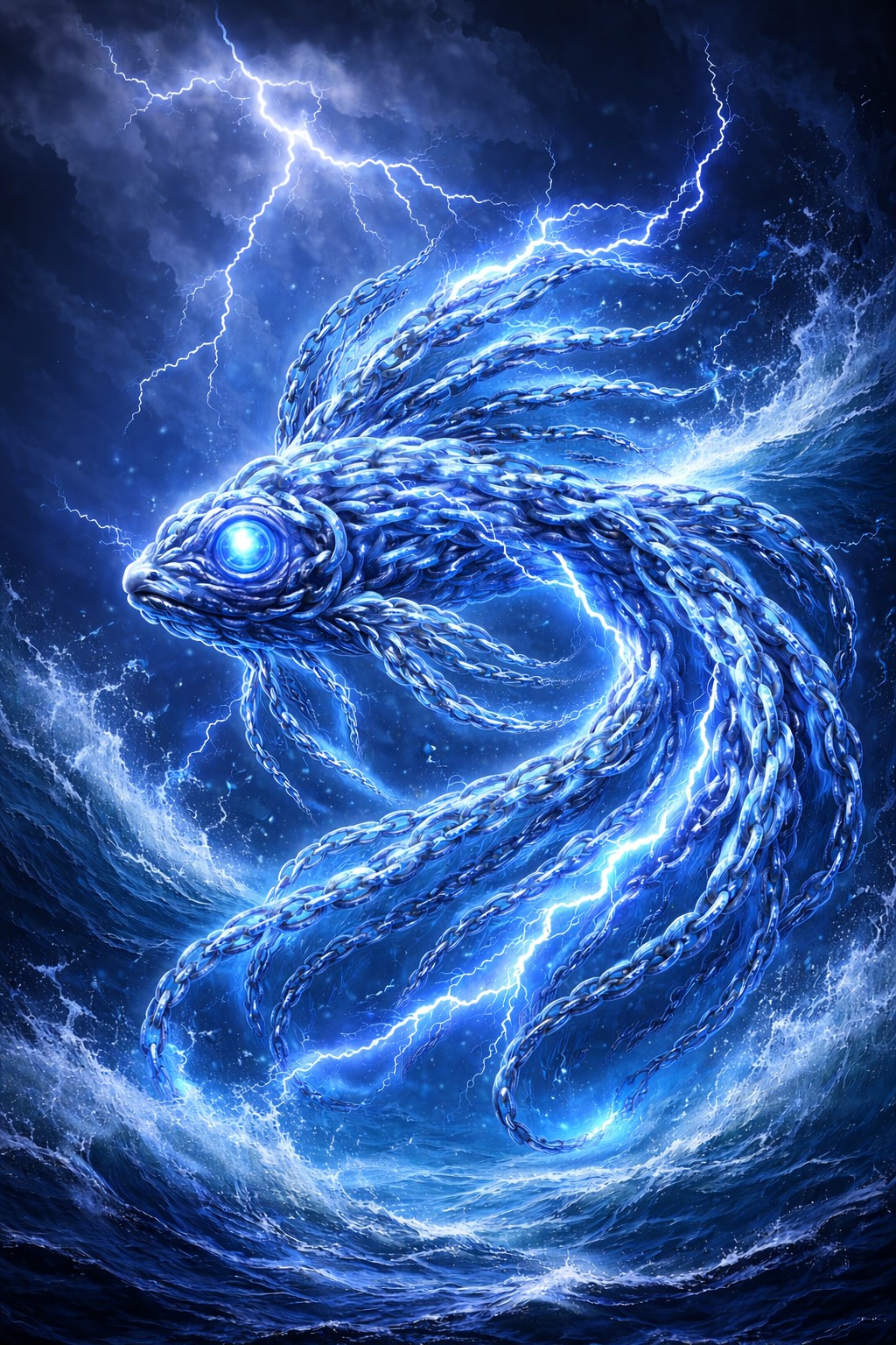 The image depicts a powerful and mystical goldfish made entirely of intricate chains, now transformed into a radiant blue hue. Its body twists and spirals through a turbulent, stormy sea, crackling with vivid electric blue lightning that illuminates the scene. The chains that form the fish’s body shimmer with a glowing, otherworldly light, enhancing its ethereal nature.