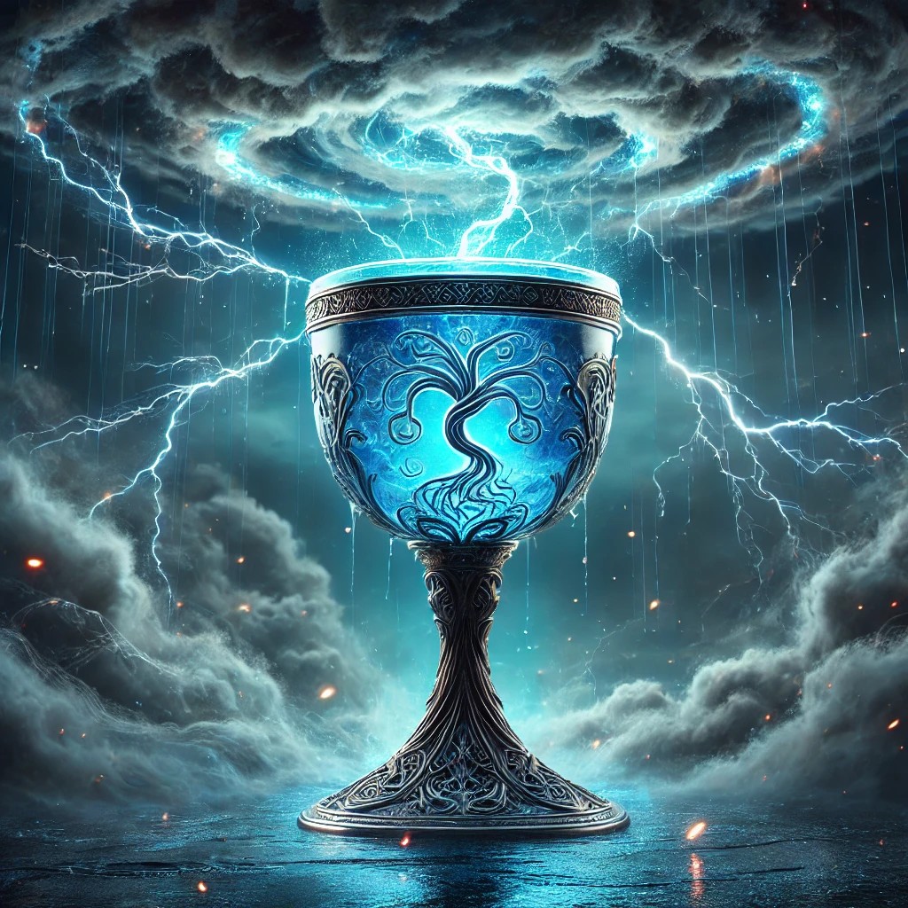 The Grail of the Tempest—a legendary artifact of raw elemental power. Forged from pure, sapphire-blue crystal, its surface glows with an otherworldly light. Intricate carvings of swirling clouds and jagged lightning bolts adorn its body, as if capturing the very essence of a raging storm. Veins of electric energy pulse through the chalice, illuminating the air around it with flickering storm light.