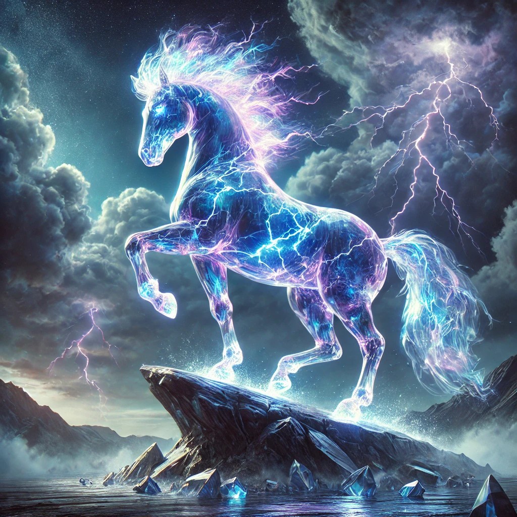 The image features a majestic horse sculpted entirely from translucent blue and purple crystal, glowing with an inner energy. Lightning crackles through its body, illuminating the intricate details of its crystalline form. Its mane and tail swirl like storm clouds, infused with flashes of electricity, giving the impression that the horse is a living embodiment of a tempest.