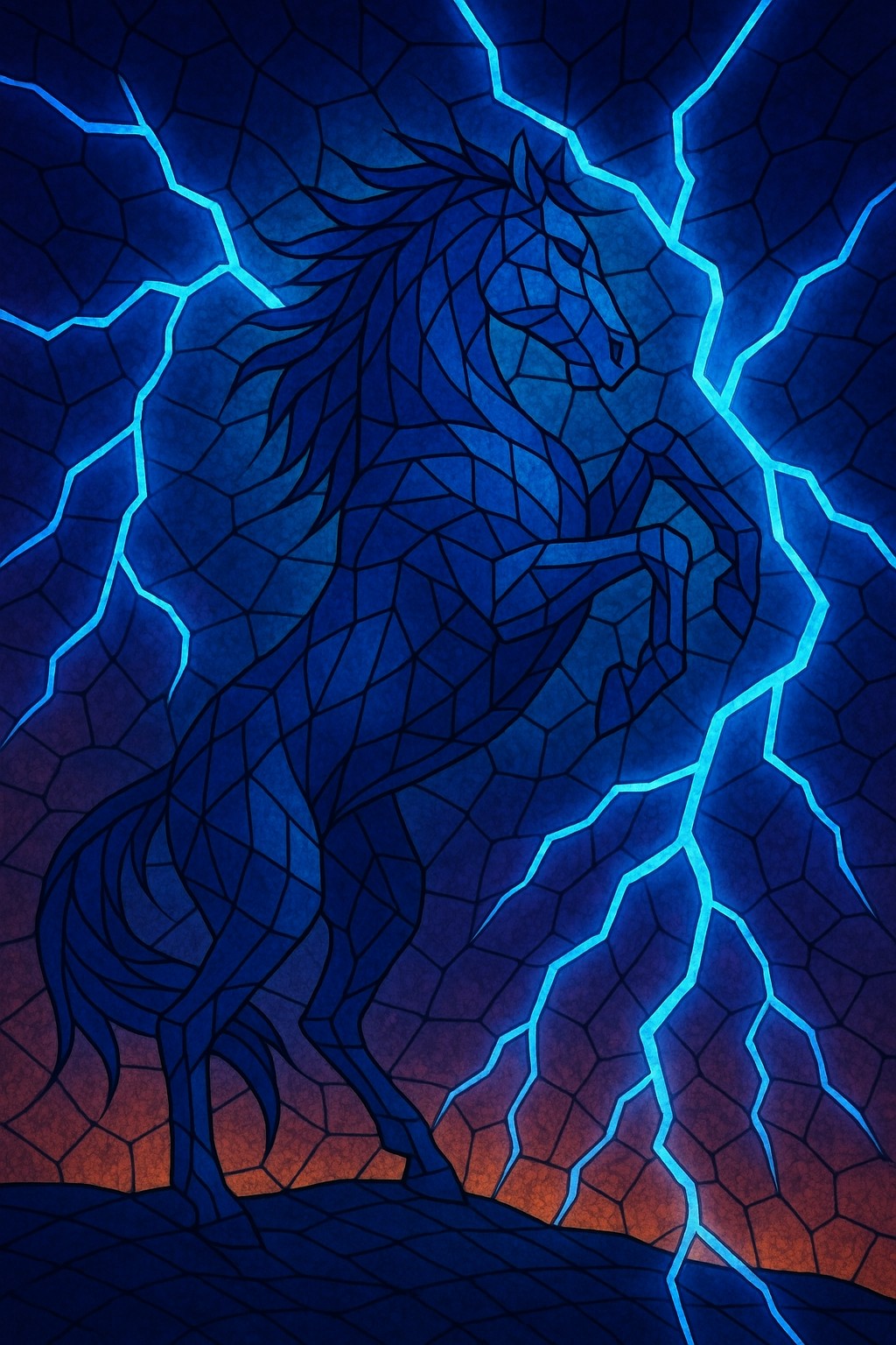 This digital abstract mosaic powerfully portrays a storm-element horse, captured mid-rear in a dramatic stance. Crafted from sharp, angular glass-like tiles in deep blues and purples, the horse exudes a sense of energy and untamed spirit. Bright, electric-blue lightning bolts crack through the scene, illuminating the sky and reflecting off the horse’s sleek form.
