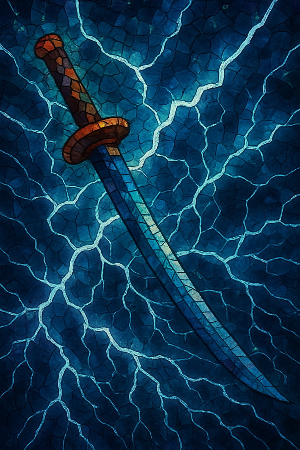 This image features a digital abstract mosaic of a katana set against a dynamic, electrified backdrop. The katana is composed of irregular, colorful mosaic tiles, with a curved blade and a multi-hued handle showcasing warm tones like oranges and reds. The sword slices diagonally across a vivid storm-themed background, which bursts with cracks of lightning and swirling cool blues, mimicking shattered glass or ceramic.