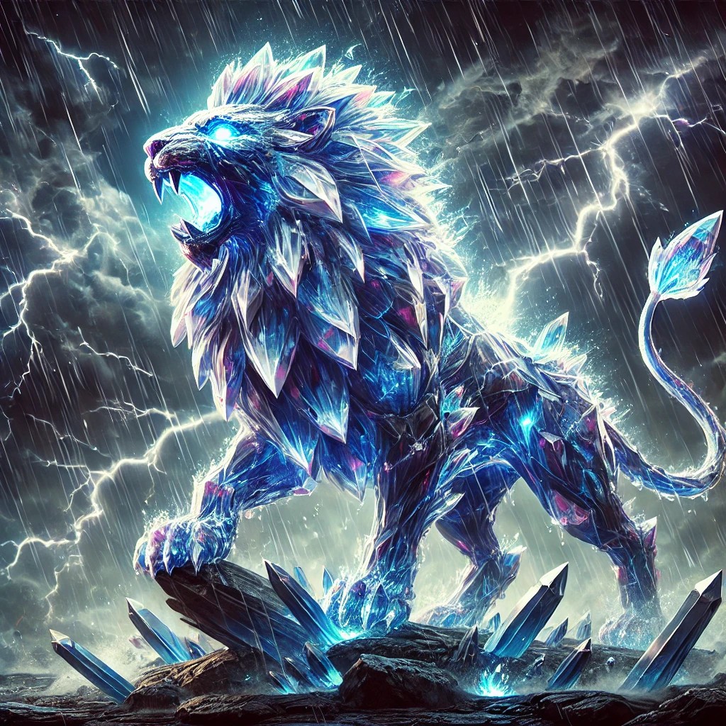 The image showcases a majestic crystal lion infused with storm energy, standing proudly on a rugged rocky pedestal. The lion’s body is composed entirely of translucent blue and purple crystals, with jagged edges mimicking the sharp intensity of lightning bolts. Glowing white energy courses through its body like veins of pure electricity, illuminating its fierce form.