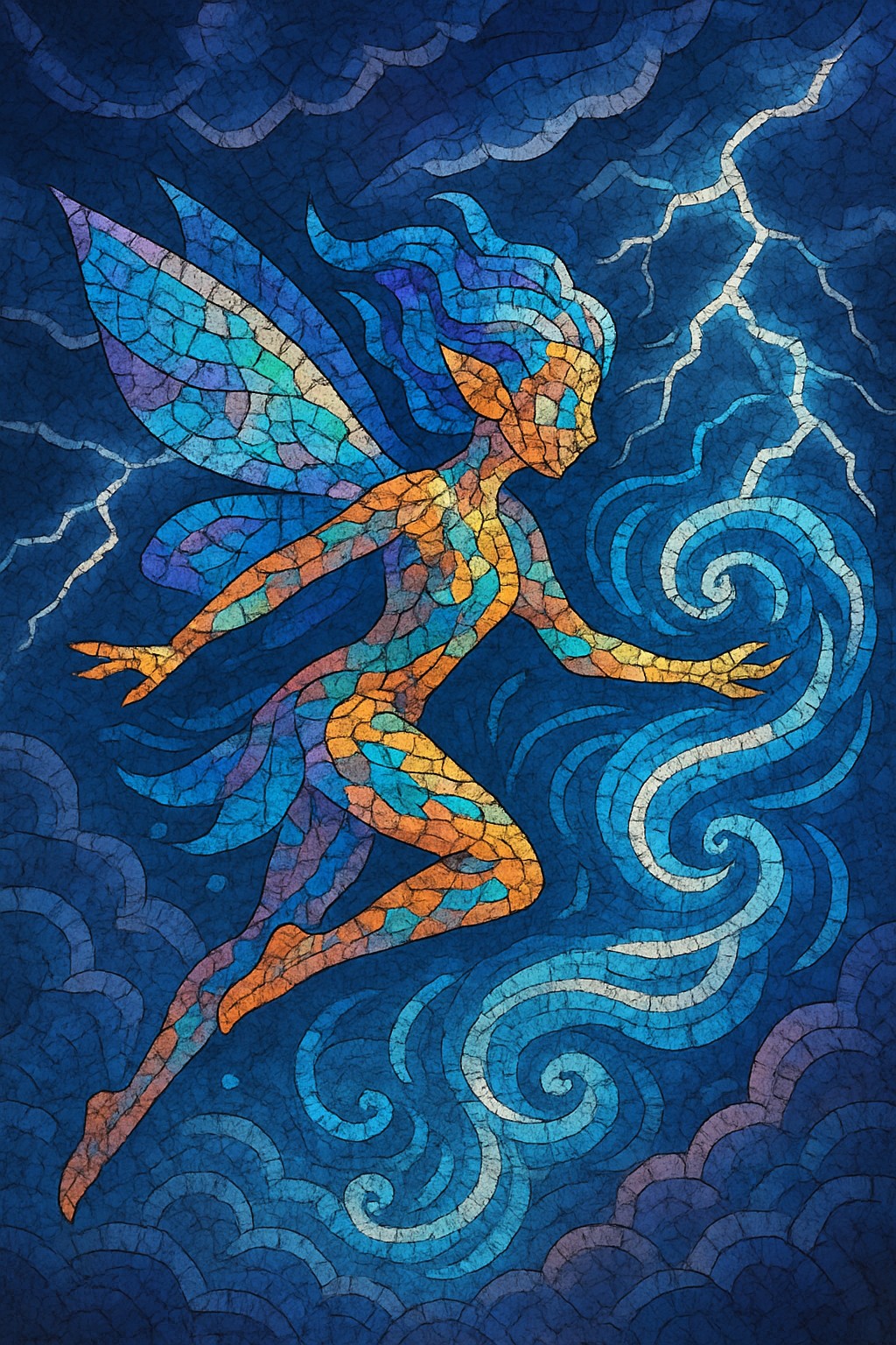 This digital artwork features an abstract mosaic of a pixie imbued with the storm element. The pixie’s form is composed of vibrant, tessellated fragments in shades of electric blue, violet, gold, and turquoise, arranged to create a dynamic and ethereal figure. Her wings resemble stained glass, fanning out with luminous hues and intricate patterns.