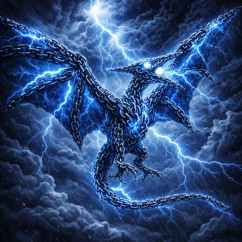 A colossal pterodactyl made of interlocking steel chains soars through a raging storm, its entire body pulsing with electric-blue energy. Each link along its wings and serpentine tail is rimmed with crackling lightning, turning the metal into glowing veins of power against the dark, rain-soaked clouds. Forks of lightning streak across the sky and seem to converge on the creature, feeding its radiant, white-blue eyes and illuminating its razor-sharp beak and talons.