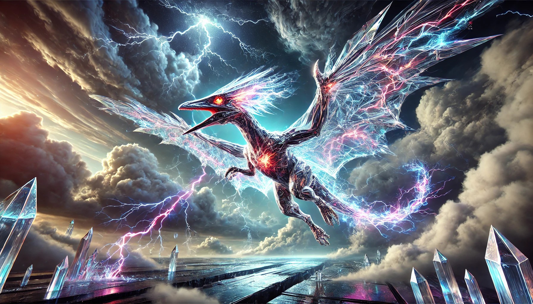 This breathtaking artwork features a Crystal Pterodactyl infused with storm energy, a mythical fusion of prehistoric power and raw elemental force. Its entire body is forged from jagged, translucent crystal shards, refracting the light from the stormy sky around it. Bolts of lightning crackle across its wings, illuminating the intricate crystal patterns that form its aerodynamic structure.