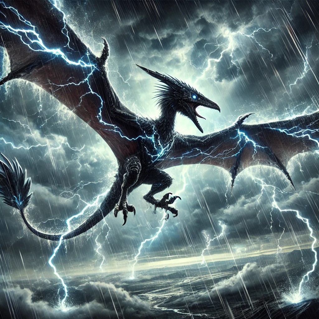 “Storm Pterodactyl,” imagine a powerful creature soaring through a sky filled with dark storm clouds and flashing lightning. Its body crackles with electricity, and its wings are charged with energy, trailing bolts of lightning as it flies. The pterodactyl’s scales are dark and metallic, reflecting the stormy skies, and its eyes glow with the intensity of a raging storm. Thunder rumbles as it beats its wings, and powerful gusts of wind swirl around it.