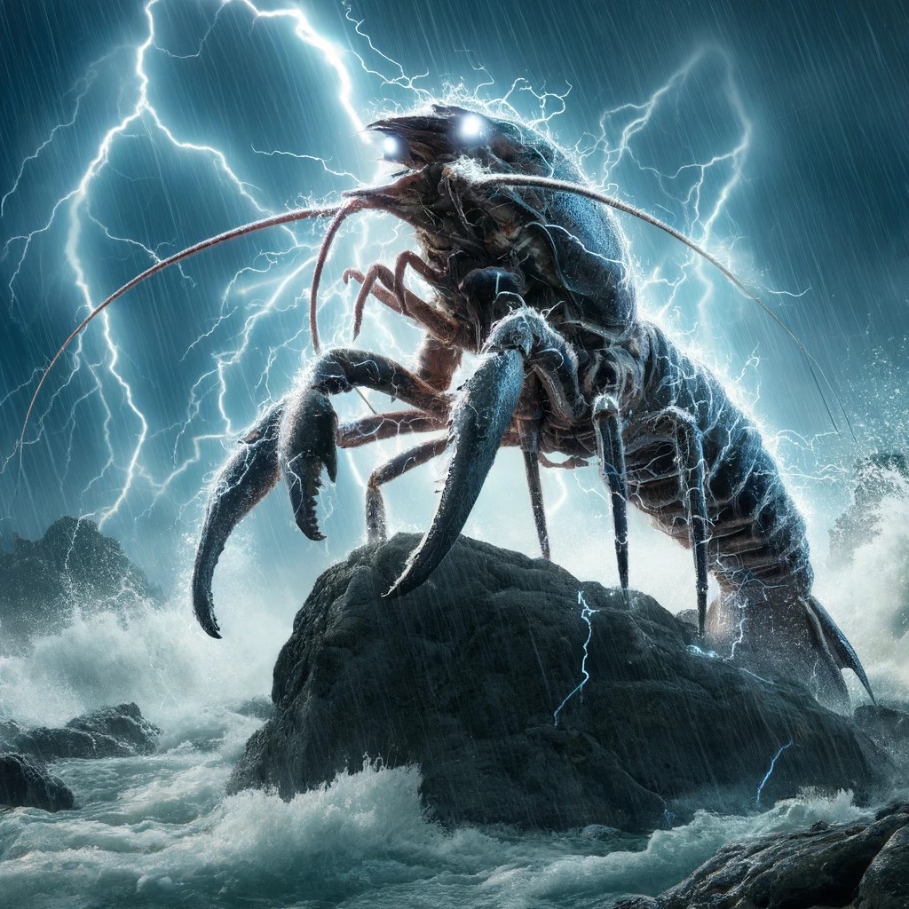 Storm shrimp standing on a jagged rock, surrounded by the fury of a raging storm. Its lower body, while shrimp-like, is armored with dark, stormy scales that crackle with electricity. The upper half is more humanoid, with powerful arms that resemble lightning bolts, sparking with energy. The shrimp’s shell is a deep, stormy gray, with swirling patterns that mimic thunderclouds.