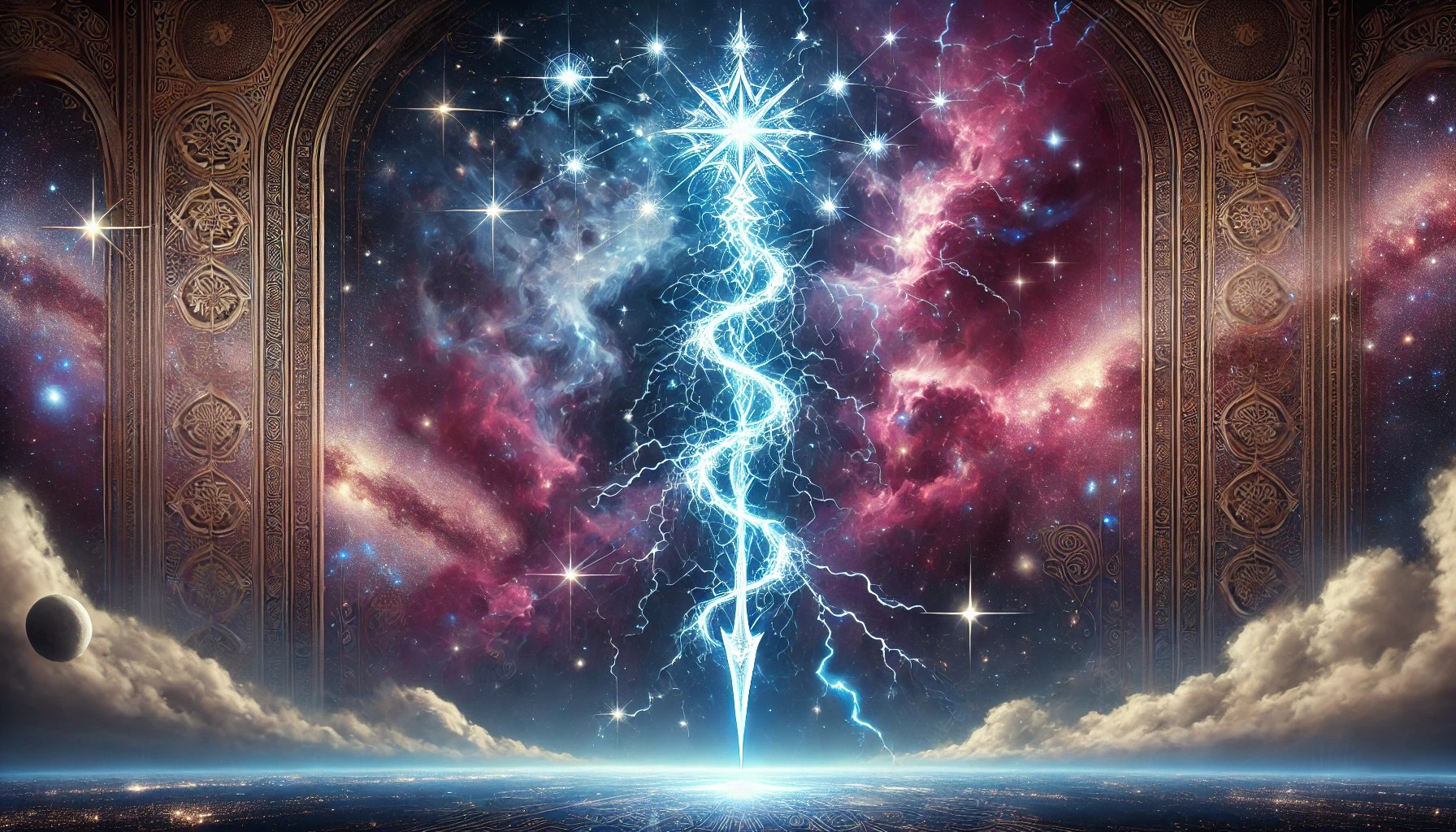 The image features a breathtaking cosmic spear-shaped constellation, radiating with storm energy. The spear is outlined by brilliant celestial stars connected through shimmering, lightning-blue lines, forming a precise and powerful structure. Within the spear, swirling cosmic dust and nebulae pulse with crackling white and violet energy, embodying the raw force of a storm.