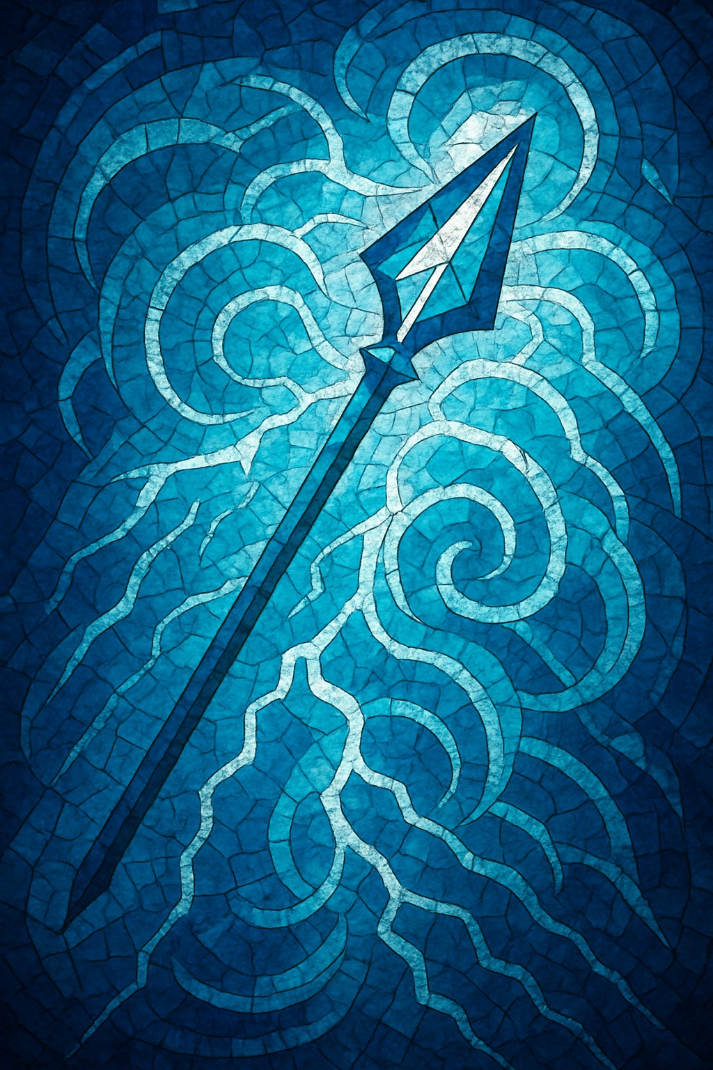 This image is a digital abstract mosaic depicting a spear infused with the element of storm. The spear, with a sharp, angular head and elongated shaft, is formed from intricate geometric mosaic tiles. It’s set against a swirling background of storm motifs — stylized lightning bolts and spiraling wind patterns — rendered in shades of blue and teal.