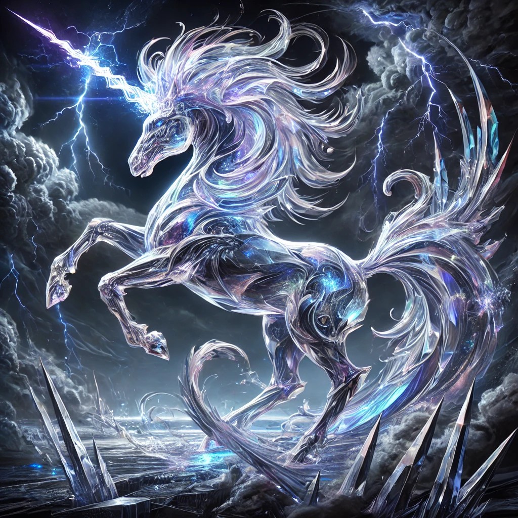 A dazzling crystalline sculpture of a unicorn, crafted from translucent crystal with intricate, jagged facets. The unicorn’s elegant yet powerful form is illuminated by an ethereal glow, with its flowing mane and tail shimmering with the energy of a storm. The crystal radiates intense hues of electric blue, silver, and violet, symbolizing the storm element. Lightning arcs from the unicorn’s spiraling horn, crackling with electric energy, while the unicorn’s body radiates power. Swirling storm clouds surround the figure, with flashes of lightning that enhance the illusion of wind flowing through the unicorn’s form.