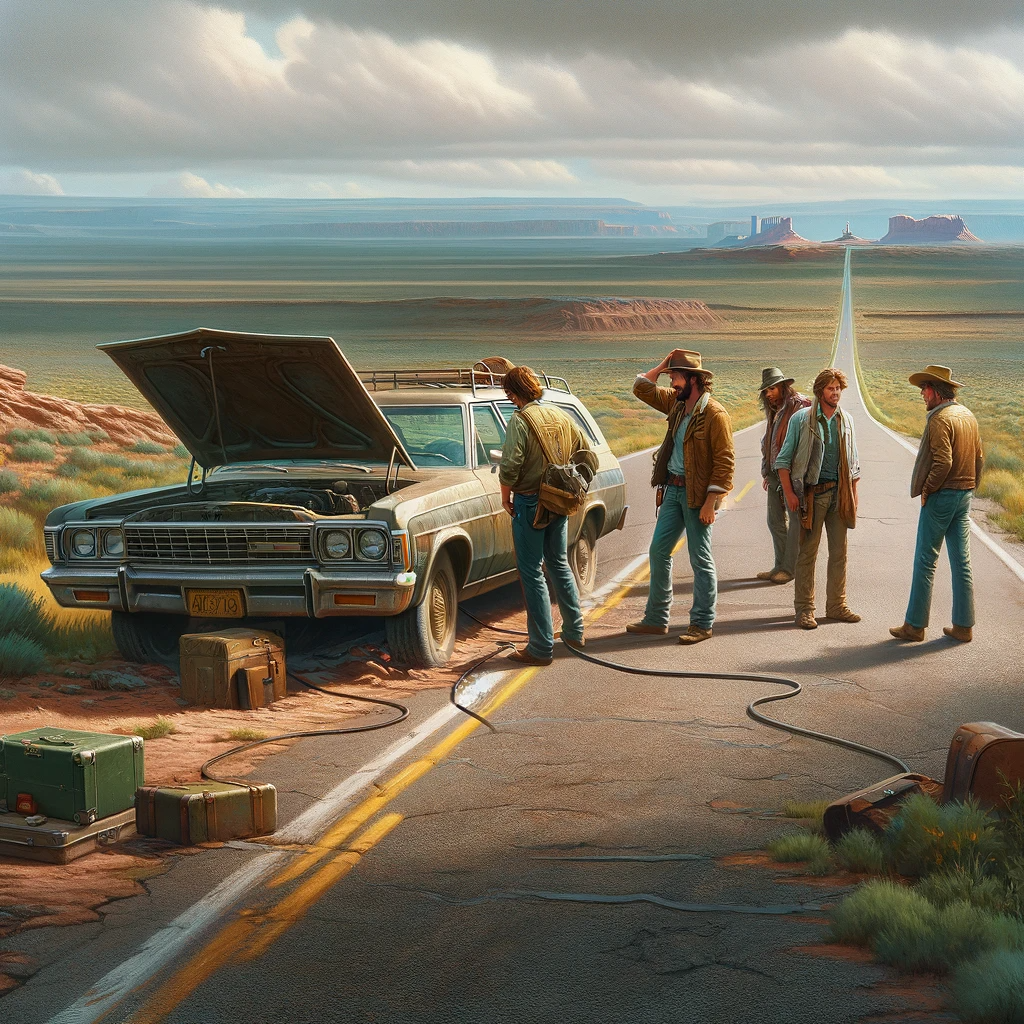In this poignant image, a group of weary road travelers stands forlornly beside their stranded car in the middle of a desolate, winding highway. The once-promising journey has come to an abrupt halt, and frustration is etched on their faces as they assess the mechanical woes that have disrupted their plans. The vast and empty landscape around them amplifies their sense of isolation, emphasizing the challenges they face in navigating this unexpected setback. Despite the adversity, they cling to a glimmer of hope, their resilience and determination unwavering, ready to overcome this unexpected obstacle on their path.