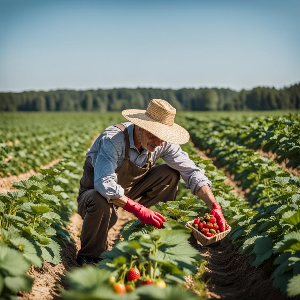 Under the warm sun, a man stoops amid rows of strawberry plants, fingers delicately plucking ruby-red treasures. The earthy scent mingles with the sweet fragrance of ripe berries. His hands, stained with the essence of summer, reveal a harvest of nature’s bounty. Each pluck is a taste of sun-kissed sweetness, a connection to the earth’s abundance.
