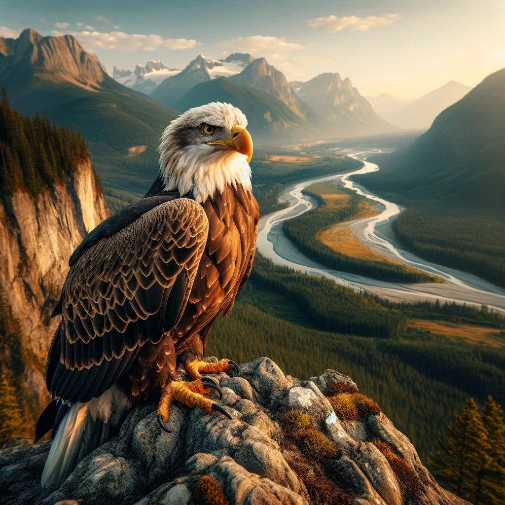 Perched high on a rugged cliff, an eagle commands the horizon with sharp, focused eyes. Its majestic form, outlined against the sky, exudes strength and grace. Each feather is meticulously detailed, catching the light as it ripples in the wind, a testament to the bird’s unrivaled beauty and power.