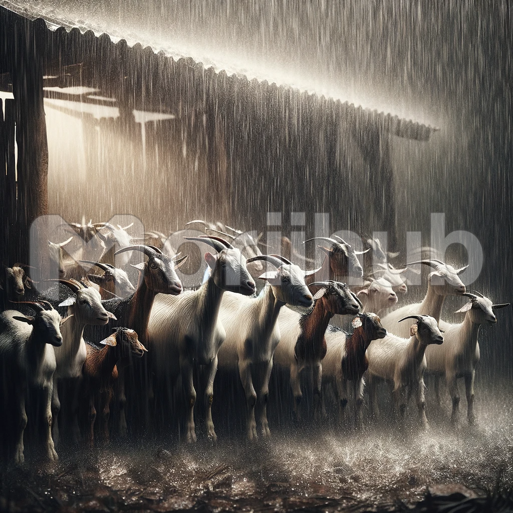 In a poignant scene, a group of resilient goats stands united under a relentless downpour. Their shaggy coats are drenched, and they huddle together for warmth and shelter. Their expressions vary; some appear stoic, braving the elements, while others exhibit a sense of vulnerability. Their unity in adversity showcases the indomitable spirit of these creatures, a reminder of nature’s strength and the beauty of perseverance amidst adversity.
