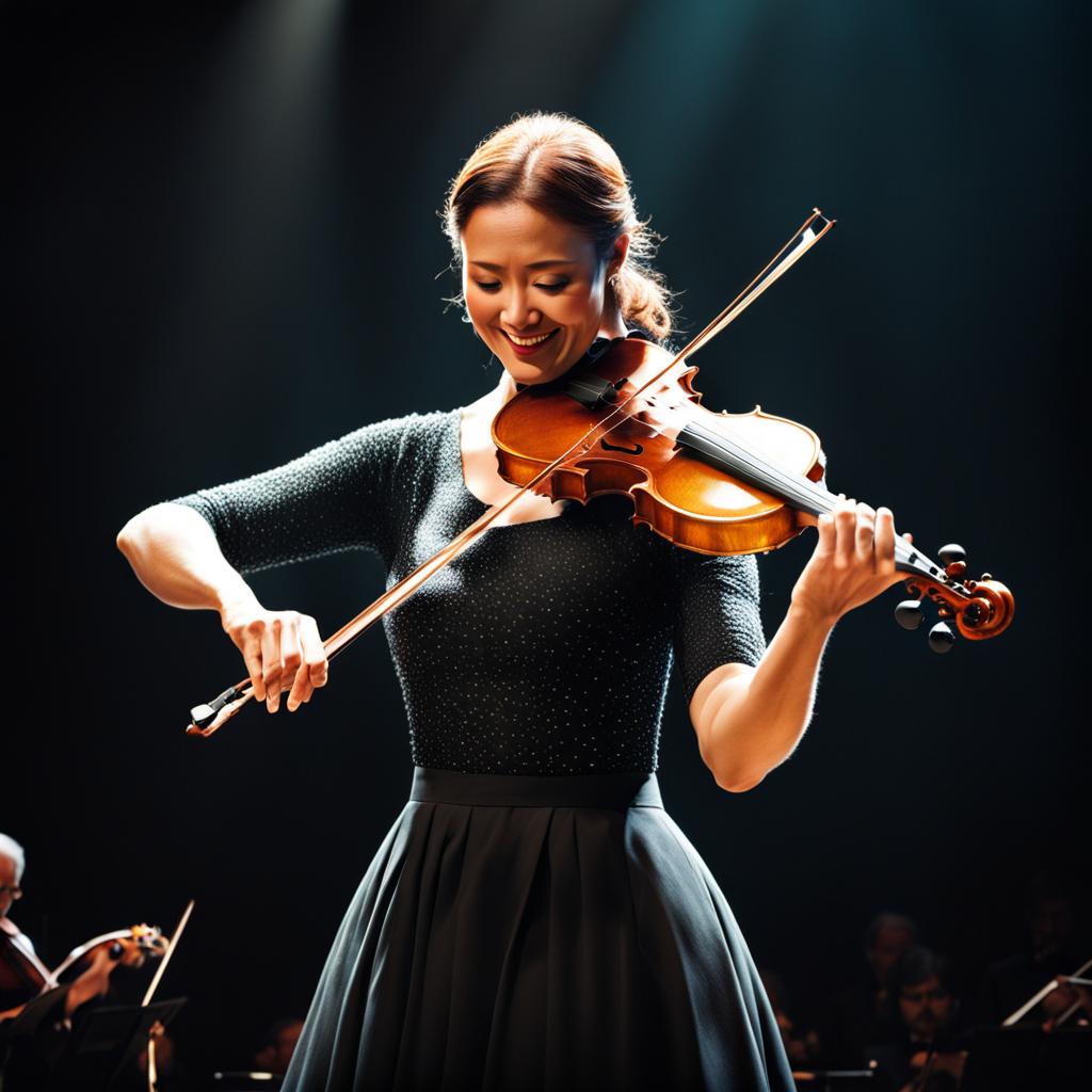 Dressed in an elegant black gown that echoes the refined notes she draws from her violin, a woman graces the stage with poise and grace. The soft spotlight embraces her as she smiles, each note resonating with passion. Her fingers dance along the strings, creating a symphony of emotion that captivates the audience. In this moment, the music and her radiant smile converge, casting a spell that transcends the boundaries between performer and audience in a harmonious and enchanting performance.